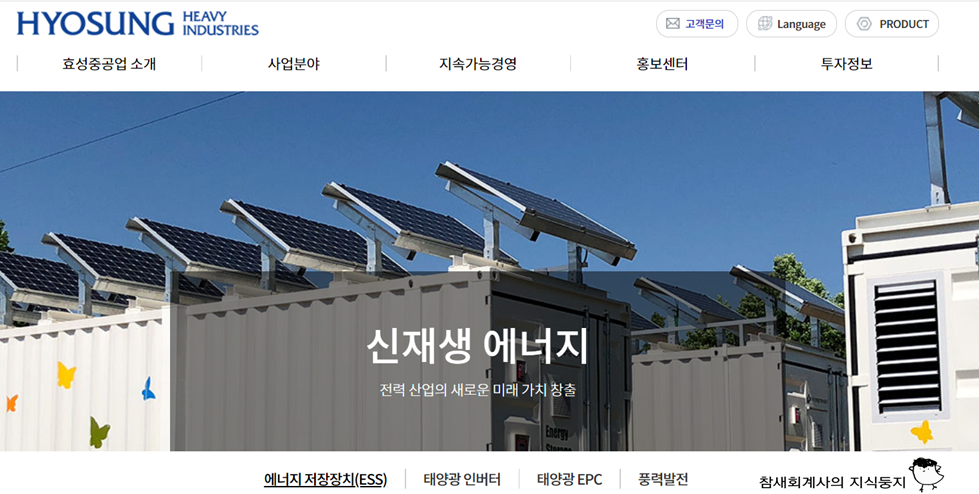 - 효성중공업은 풍력 및 태양광의 신재생에너지 관련 사업을 영위 중입니다. 태양광 발전소 건설 및 태양광 발전소의 안정적 운영을 위한 고효율 태양광 인버터 솔루션, 풍력터빈 및 해상용 풍력발전기 등을 제공하고 있습니다.