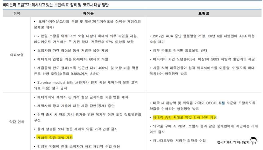 여기서 우리가 주목해봐야 할 것은 두 후보 모두 약값 인하를 위한 수단으로 제네릭의 활용이 언급되고 있다는 것입니다. 우리나라 제약 바이오기업들이 강점을 보이는 제네릭이 미국 내에서 승인이 확대될 경우 우리나라 헬스케어 산업에 긍정적인 영향을 미칠 것으로 보입니다.