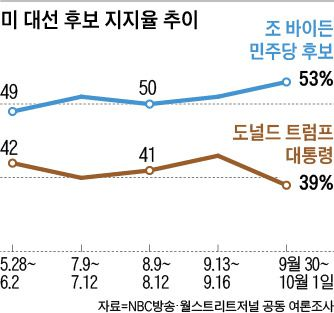 2020년 10월 4일 월스트리트 저널과 NBC가 공개한 여론조사 결과에 따르면 바이든의 지지율은 53%, 트럼프의 지지율은 39%로 발표되었습니다.
