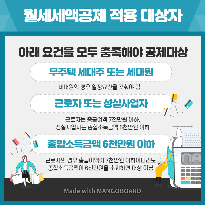 월세세액공제는 원칙적으로 해당 과세기간의 총급여액이 7천만 원 이하이면서 종합소득금액이 6천만 원 이하인 근로소득이 있는 근로자에게 적용됩니다.