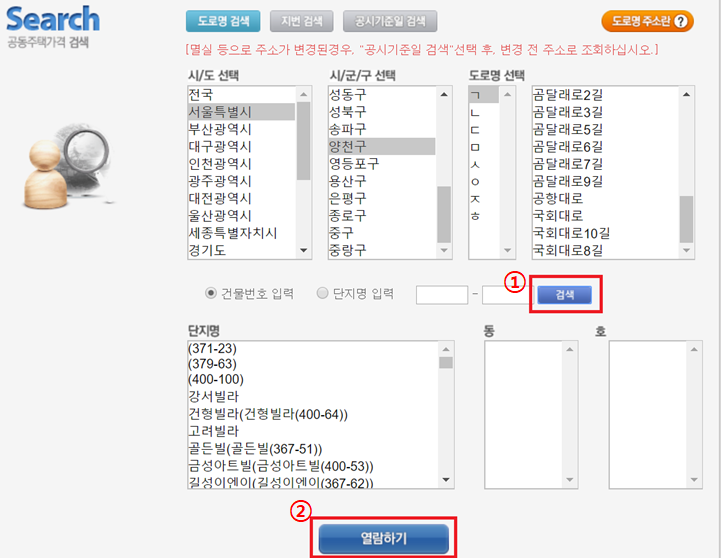 ▼ 먼저 아파트일 경우를 예로 들어서 조회해보겠습니다. 공동주택가격열랍탭에 들어오면 아래와 같이 주소를 입력하는 곳이 있습니다. 전부 입력하고 검색 버튼(①)을 누릅니다. 그러면 아래 단지명 등 개별 동호수를 선택하는 곳이 나오고 전부 입력 후 열람하기 버튼(②)을 누릅니다.