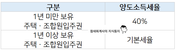주택 및 조합원입주권에 적용되는 양도세율은 보유기간에 따라 다음과 같이 적용됩니다. 1년 이상 2년 미만 보유 구간이 있는 토지와는 달리 주택은 1년을 기준으로 40%의 중과세율을 적용할지 기본세율을 적용할지 정합니다.